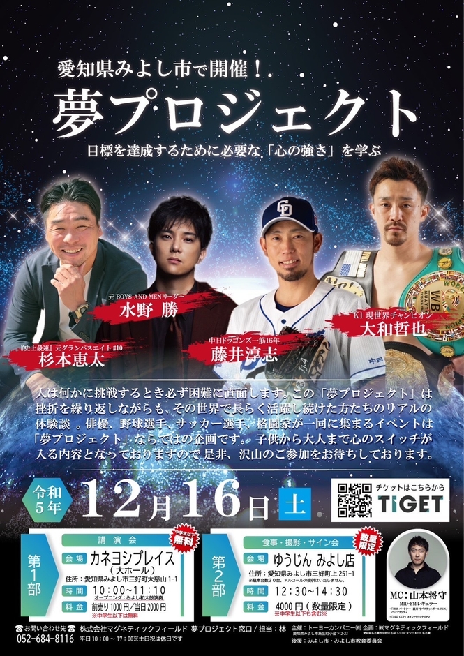 人は何かに挑戦するとき必ず困難や挫折に直面します。この夢プロジェクトは困難や挫折を繰り返しながらも、その世界で長らく活躍し続けた方達のリアルな体験談を通して心の持ち方や強さを学べるトークイベントです。俳優、サッカー、野球、格闘家が一堂に集まるイベントは「夢プロジェクト」ならではの企画です。