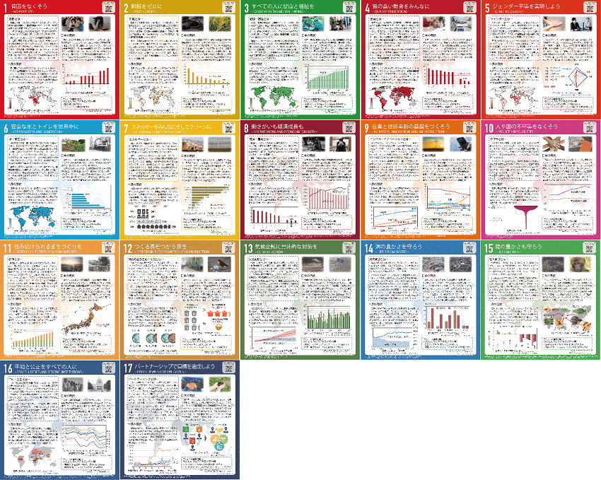 「SDGsスタディパネル」は、SDGsのゴールごとに、関連するキーワードや世界と日本の現状がまとめられた計17枚のパネルです。教育現場はもちろんのこと、あらゆる分野の皆様のSDGs理解促進にもご活用いただけます。