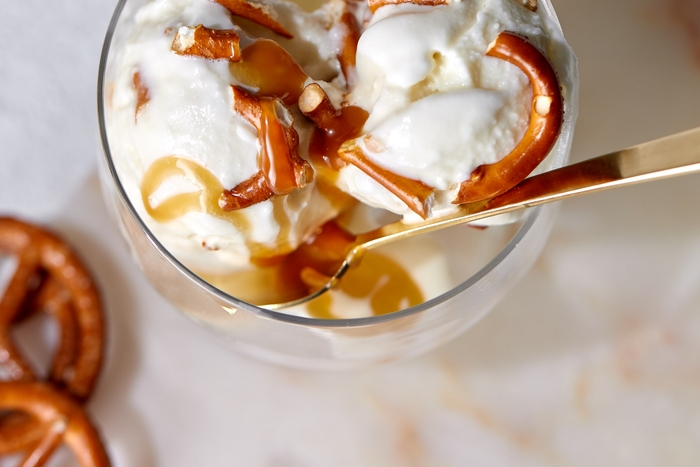 塩キャラメルプレッツェル:ミルクアイスと塩キャラメルクリームをミックスし、オーガニックのプリッツェルを混ぜ込んだフレーバー。グラスフェッドバターやオーガニックのさとうきび、ヒマラヤ岩塩など良質な材料をふんだんに使用。