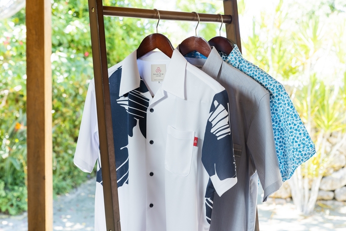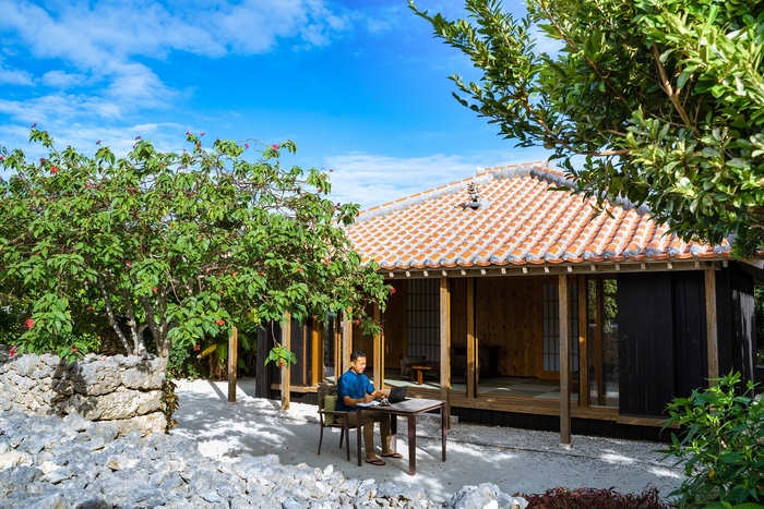 旅行先でもしっかりと仕事に臨めるよう、様々なビジネスアイテムを揃えたワーケーションセットを客室に用意します。オフィスでの仕事と同様のアイテムが揃う事で、場所が変わっても不自由なく仕事ができます。また、島の伝統的な建築を踏襲した一戸建ての客室は、石垣によってプライベート感を守りながら、開放的な庭付きです。仕事をする場所を、日中は風の通る涼しい室内のソファにくつろぎながら適度なリラックスの中で。日差しが柔らかな朝や夕方には庭にあるテーブルで自然の音や香りを感じながらなど、天候や時間によって場所を変えることで気分転換できます。さらに、ワーケーションセットに含まれている沖縄の正装「かりゆしウェア」は、沖縄の気候に合わせた仕立てであるため、島で過ごすのに適している衣服です。滞在中は、アイロン掛けをしたかりゆしウェアを毎日客室に届けます。長期滞在でも荷物を最小限にすることができ、かつ突然のTV会議の服装にも困ることがありません。