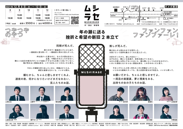 ムシラセ2021年本公演『つやつやのやつ』と『ファンファンファンファーレ!』が2021年12月8日(水)~12月12日(日)にオメガ東京(東京都杉並区)にて上演されます。チケットはカンフェティ(運営:ロングランプランニング株式会社、東京都新宿区、代表取締役:榑松 ⼤剛)にて10月26日(火)より発売開始予定です。