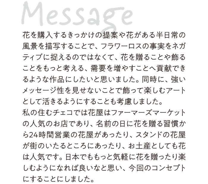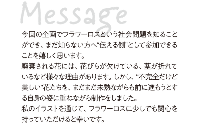 昨年4月緊急事態宣言を受け行き場を失ってしまったために突如大量に発生したフラワーロスの現実を解決するため立ち上げた生家のオンラインD2C販売「スマイルフラワープロジェクト」https://jfc.thebase.in を始めとして、フラワーライフ振興協議会の立ち上げ、フラワーロスの社会課題の解決に向け、持続可能な生産と流通改革、農家支援のための取り組みを行なっている。