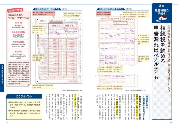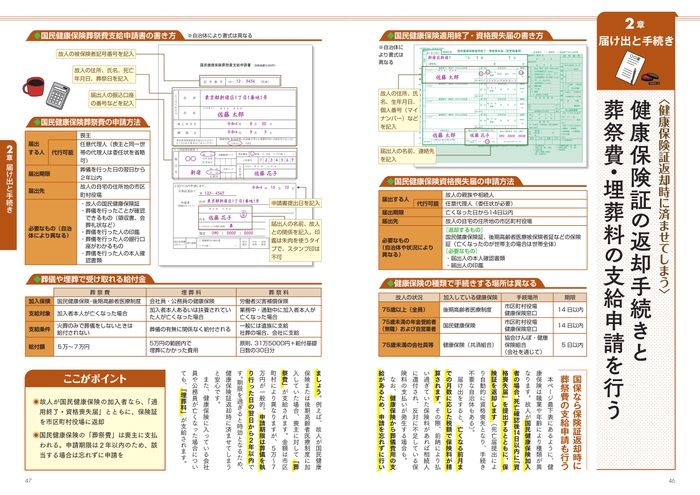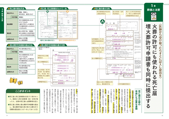死後の手続きの書類の多くは手書きです。ただでさえ慌ただしいなか、記入ミスや記入漏れによる再提出は誰にとっても避けたいところ。本書では、重要書類36点の書き方見本を大きく掲載しています。