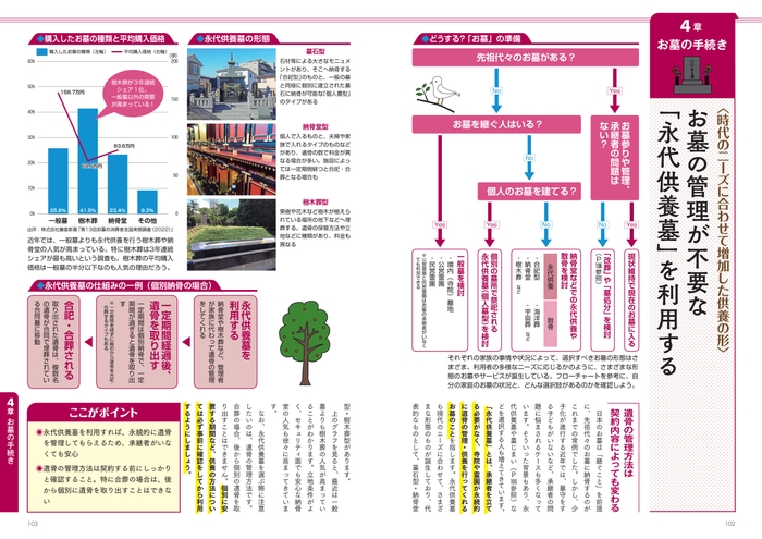 本書は、死後の4大手続きである「葬儀と法要」「役所への届け出」「遺産相続」「お墓」の流れとポイントを、一目でわかる図解やタイムスケジュール表、大きな文字でやさしく解説しています。