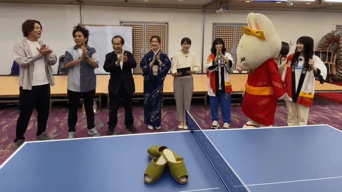 大人気コンビ「ぺこぱ」(松陰寺太勇・シュウペイ)をゲストに、沖ちゃん(沖侑果)&舞Q(中村舞)がまず挑むのは、湯田温泉名物「スリッパ卓球」!