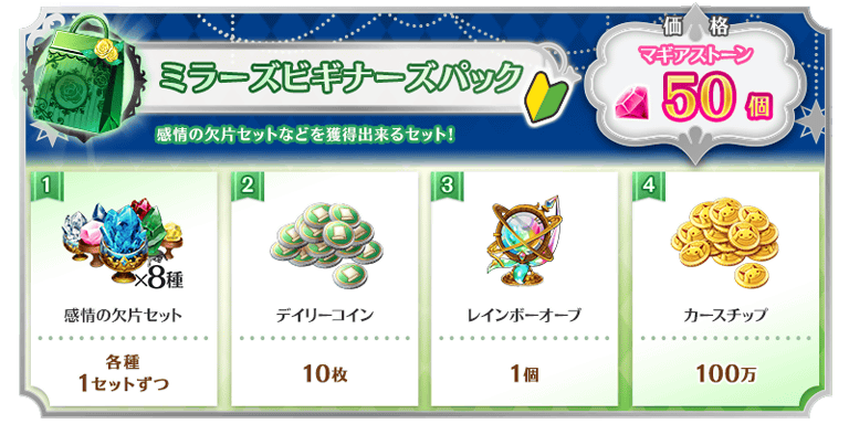 無償を含むマギアストーンで購入できる「ミラーズビギナーズパック」には以下のアイテムが封入されています。