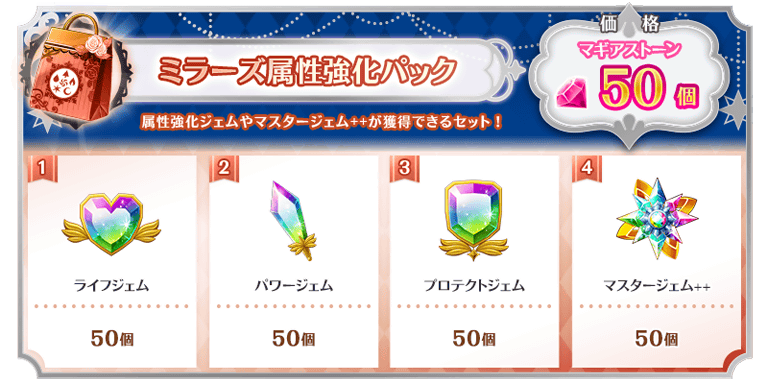 無償を含むマギアストーンで購入できる「ミラーズ属性強化パック」には以下のアイテムが封入されています。