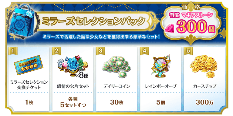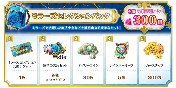 有償マギアストーンで購入できる「ミラーズセレクションパック」には以下のアイテムが封入されています。