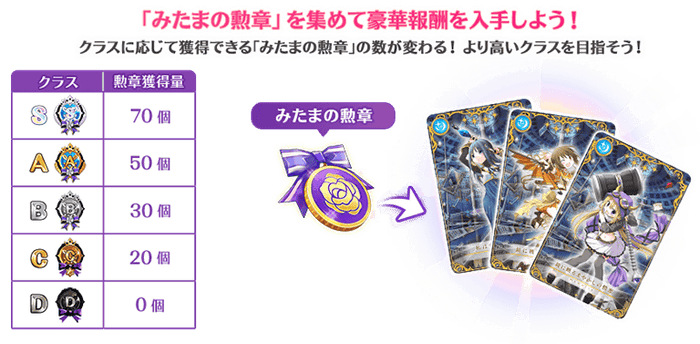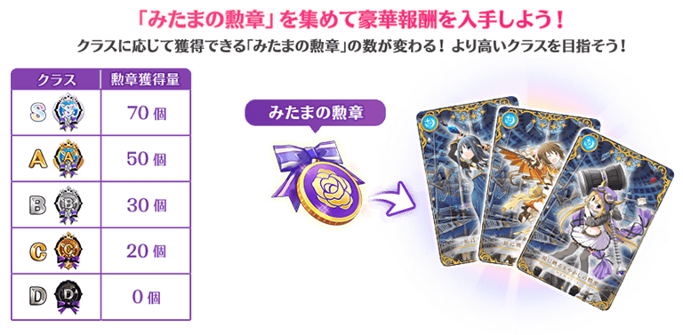 「みたまの勲章」は、予選で決定したクラスに応じて最大70個、期間限定ミッションで最大10個獲得できます。