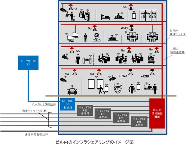 具体的には、従来の携帯キャリア通信・Wi-Fi・有線LANに加えて、ローカル5GやsXGP(※3)、LPWA(※4)等の最適な通信手段を導入することを検討します。また、各携帯キャリアの5Gやローカル5G等の複数の通信が、ビル内の無線アンテナや情報通信線等を共用する「インフラシェアリング」を導入することを想定しています。これにより、通信インフラを効率的にかつ低コストで整備することが可能となります。