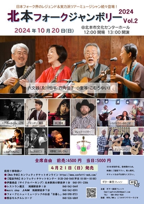 ギター楽団フレッツ主催、六文銭と実力派ツアーミュージシャン『北本フォークジャンボリー2024』が2024年10月20日 (日)に北本市文化センター ホール(埼玉県 北本市 本町 1丁目2-1)にて開催されます。
