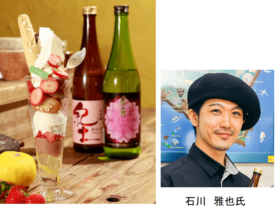 パティシエ・唎酒師として活躍する石川氏が、奈良・和歌山の日本酒と、大阪の人気チョコレート店、ジェラート店をLINKさせたパフェが登場します。チョコレートジェラートの軽やかな甘さと、ほろ酔い気分を味わえる贅沢な一品。