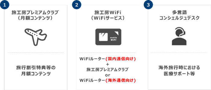 合弁会社では、旅工房による旅行割引特典などが受けられる「①旅工房プレミアクラブ(仮称)」、光通信グループから提供される通信サービスを活用した国内旅行者向けのインターネットサービス「②旅工房Wi-Fi(仮称)」並びに、インバウンドテックから海外旅行者向け「②旅工房グローバルWi-Fi(仮称)」及び海外旅行時のコロナ感染や医療相談など、旅行先で使える通訳サービス「③多言語コンシェルジュデスク(仮称)」のサービスの企画・提供を予定しており、今後もサービスメニューは随時拡大してゆく予定です。
