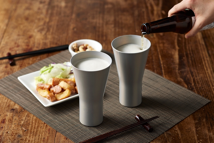 ①タンブラー内面の特殊加工で、ビールを注ぐときめ細かで均一な泡立ちと泡もちの長さを実現します ※特許出願中