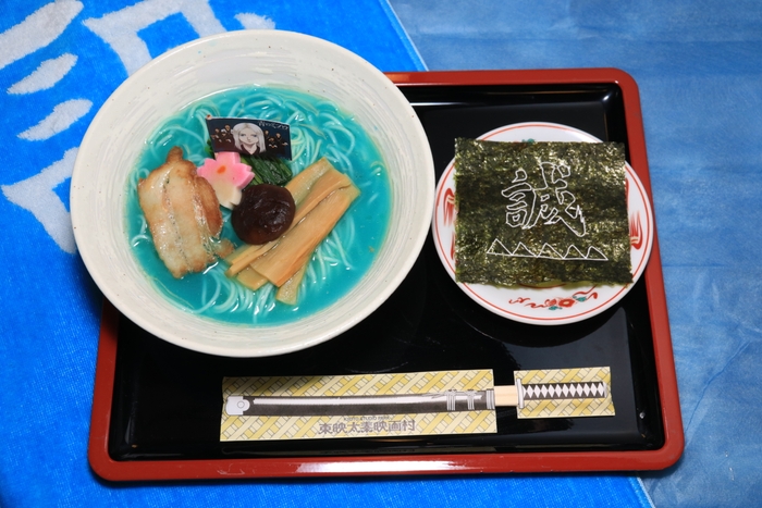 また映画村では原画の展示のほか、作品をイメージしたコラボメニューを提供します。インパクト抜群の青いスープのラーメンや近藤勇の好物「たまごふわふわ」などを召し上がっていただけます。また描き下ろしイラストを使用したオリジナルグッズも販売いたします。スタンプラリーを中心にコラボメニューや限定のコラボグッズなど、京都ならではのイベントとなっております。