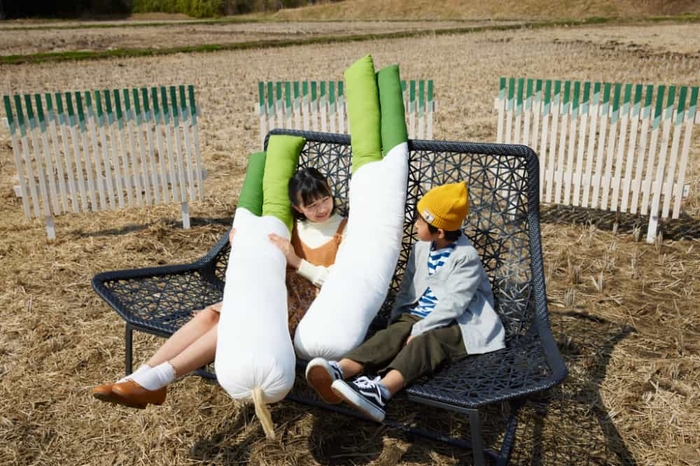 会場には、150cmほどのねぎ型クッションやねぎの色をイメージしたテーブルや椅子などがあり、イベントをより盛り上げます。椅子に腰かけて、焼きねぎを堪能したり、写真撮影を楽しんだりすることが可能です。
