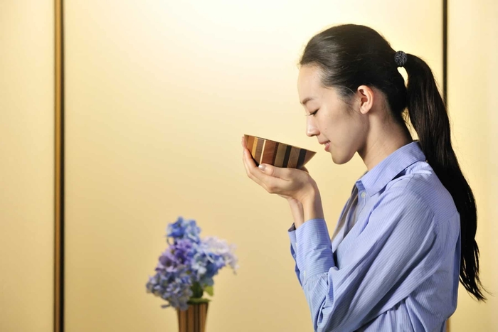 客室には、あじさいと箱根寄木細工の掛け軸をしつらえた茶室があります。この茶室にて、あじさいを模した落雁や練り切りといった和菓子を抹茶とともに楽しむことができます。提供には、箱根寄木細工の甘味盆と抹茶椀を用意します。また、一呼吸おいた後、色鮮やかな青紫色のあじさいを、ゼリーやシロップで表現した界 箱根のオリジナルかき氷「あじさいかき氷」も提供され、あじさいをテーマにした甘味を味わうことができます。
