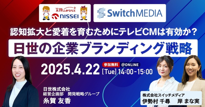 広告データ分析SaaS「TVAL(ティーバル)」を提供する株式会社スイッチメディア(本社:東京都港区、代表取締役社長:高山 俊治)は、日世株式会社と共に、2025年4月22日(火)に、オンラインセミナー「認知拡大と愛着を育むためにテレビCMは有効か?日世の企業ブランディング戦略」を開催いたします。