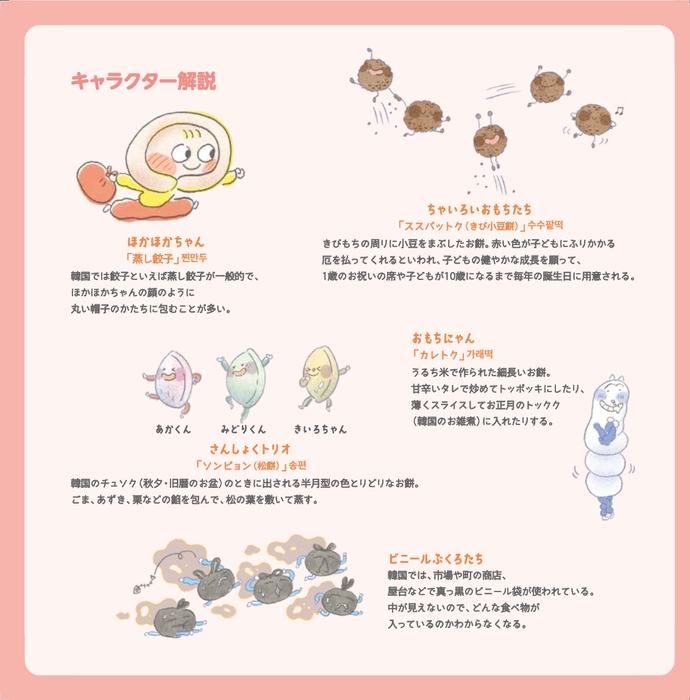 本書は蒸し餃子、色々なお餅、謎の真っ黒なビニール袋などの韓国ならではの食材や文化が織り込まれた内容になっており、それらを巻末のキャラクター解説で詳しく説明しています。