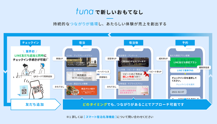 旅前ではデザインテンプレートが多数用意された宿泊特化のブッキングエンジン機能、旅中では施設・サー ビス情報や周辺情報の配信機能、旅後ではお礼メッセージやリピーター特典、ゲスト属性に応じた特別オファー等の配信機能など、『tuna』を活用することにより、旅行のあらゆるステージでゲスト一人ひとりに合わせたアプローチが可能です。