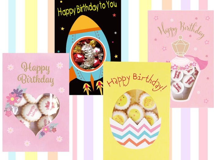 スイーツカードは、表面の窓からお菓子が見えるようになっており、お菓子もデザインの一部となっています。