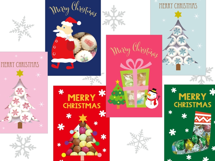 クリスマスデザインは6柄。ツリーのオーナメントには結晶柄のラムネ。サンタさんの袋にはプレゼント絵柄のアイシングビスケット。プレゼントボックスの中には、カラフルなキャンディなど。どれもこれも、受け取った人が楽しくなるデザイン! ちょっとしたプチギフトにもなる、グリーティングカードです。