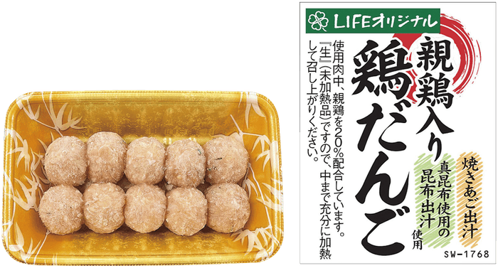 親鶏のもも肉・むね肉を配合しており、食感と旨味を楽しむことができ、焼あご出汁の味わい豊かな風味を感じることのできるライフオリジナルの鶏だんご。餃子のタネなど、アレンジしてお召し上がりいただくこともおすすめです。