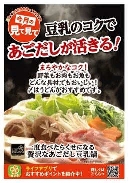 【ライフ】今年も鍋の季節が到来!「ライフプレミアム 一度食べたらくせになる贅沢なあごだし豆乳鍋」を新発売!