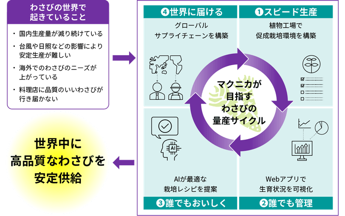 今後マクニカは、Farmalizeを始めとした当社技術を付加したわさび用コンテナ型植物工場を2023年秋頃目途に完成させ、国内総代理店として販売を開始する予定です。同工場を共同開発することで、コンテナ型植物工場の収益性改善と新規参入者を促進し、持続的・安定的な食料供給の実現に貢献してまいります。将来的には、海外市場展開も見据えた作物の販路拡大のためのグローバルサプライチェーンの構築の支援も行い、世界中に高品質なわさびを安定供給することを目指します。