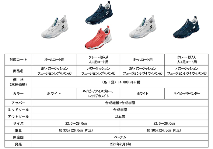 ヨネックス株式会社(代表取締役社長:林田草樹)は、新衝撃吸収反発素材「パワークッション®プラス」を搭載し、足を包み込む新設計パーツ「フュージョンウイング」採用によりフィット性を高めたテニスシューズ「POWER CUSHION FUSIONREV 4」を2021年2月下旬より発売いたします。