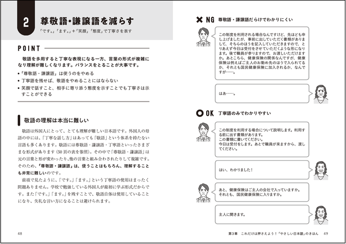 イラストを交え、NG・OKの具体的な会話例を紹介。