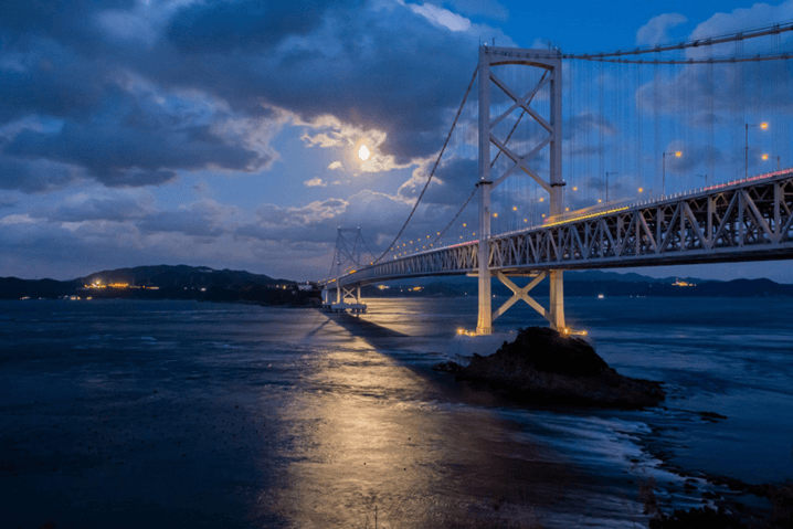 大鳴門橋をたもとから見上げるダイナミックな景色の先には、海を照らす月が煌々と輝きます。海面に映る光の道と共に辺りを灯す光景は、息を呑むほどに美しく、2021年10月15日 第七回「全国名月サミット」(夜景コンベンション・ビューロー主催)にて「日本百名月」登録鑑賞地にも認定されました。