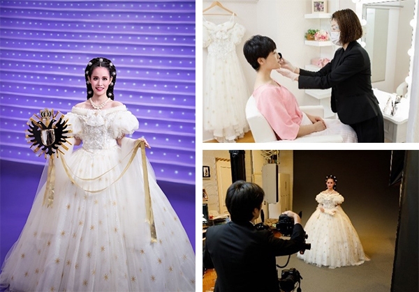 カツラ等でヘアチェンジ、衣裳へお着替え