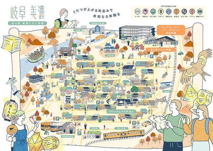 美濃市や地元事業者の皆様と協議を重ね、全面的な協力のもと作り上げた、地元の人のみぞ知る「知られざる魅力」に満ちた「よりみちマップ」となっています。美濃を旅する旅行者や地元の方にも広くご利用いただき、美濃エリアを深く旅をすることで、その知られざる魅力が広まり、観光促進・地域経済活性化が加速することを目指しています。