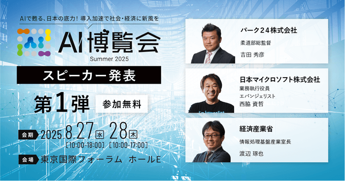 【AI博覧会Summer2025】第1弾スピーカーを発表!基調講演に柔道家「吉田秀彦氏」、マイクロソフト「西脇資哲氏」、経済産業省「渡辺琢也氏」が登壇!