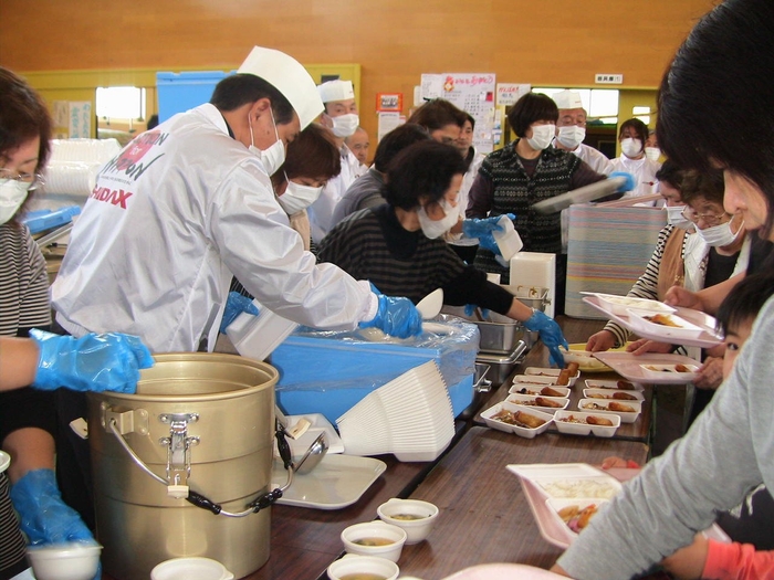震災発生直後、現地に緊急対策本部を設け、自社のみならず、一般のお客様からも募った救援物資や義援金、絵本等を、自社保有車両で被災地に輸送。その後、2011年4月に、福島県相馬市の要請により、市内の小中学校の学校給食施設を活用して避難所の食事提供を実施しました。