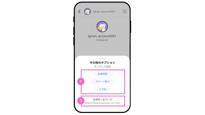エルグラムの固定メニューでインスタグラムのDM画面を簡易HP化