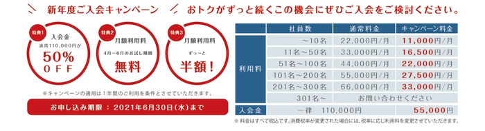 なお、2021年6月30日(水)までにお申込みいただけますと、新年度ご入会キャンペーンとして、「無料お試し期間」や「月額利用料ずっと半額」などの特典もご用意しています。