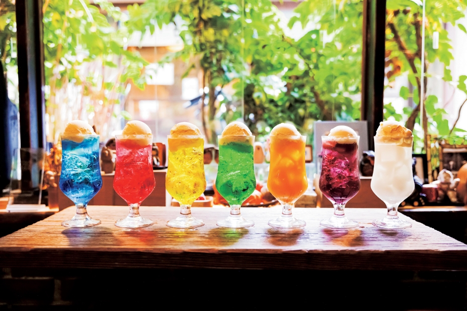 1955年創業、神保町にある人気の老舗喫茶店「さぼうる」の名物「7色のクリームソーダ」。王道であるメロン味のほか、ブルーハワイ、イチゴ、レモン、オレンジ、ブドウ、カルピス味の7種のクリームソーダが登場。