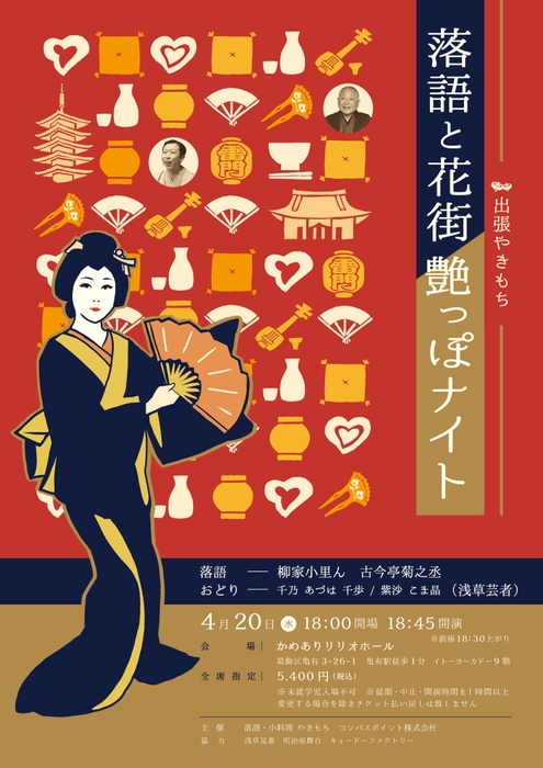 『出張やきもち 落語と花街 艶っぽナイト』が2022年4月20日(水)にかめありリリオホール(東京都葛飾区)にて上演されます。チケットはカンフェティ(運営:ロングランプランニング株式会社、東京都新宿区、代表取締役:榑松 ⼤剛)にて発売中です。