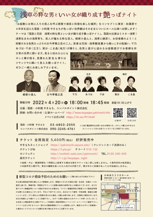 柳家小里ん・古今亭菊之丞と、現役の浅草で活躍する芸者たちによる、楽しくちょっと色っぽい「艶(つや)っぽ」な夜 『出張やきもち 落語と花街 艶っぽナイト』4/20開催!カンフェティにてチケット発売中