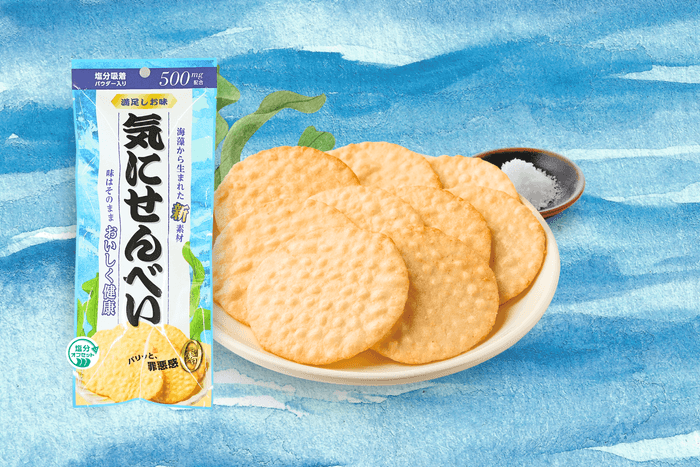 この商品はしお味の元祖うす焼き煎餅ブランド「オランダせんべい」に当社が開発した海藻由来の『塩分吸着パウダー』を配合することで、いつものおいしい塩味はそのままに健康をサポートしてくれる煎餅です。