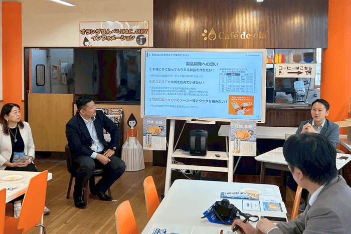 また、酒田米菓株式会社の佐藤副社長は「当社では2021年より、たんぱく質を効率よく摂取できる煎餅『ミライオニギリ』など、健康志向の高まりに対応した商品を展開しております。そのような中でトイメディカルの技術や取り組みを知って共感し、今回のコラボレーションに賛同しました。この『オランダせんべい 気にせんべい』を通じて、東北エリアにおける販路拡大にも協力していきたいと考えています。」と述べました。