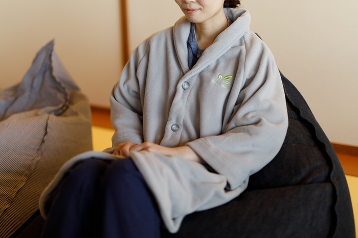 パジャマの上から羽織れる、フリース素材のルームガウン。