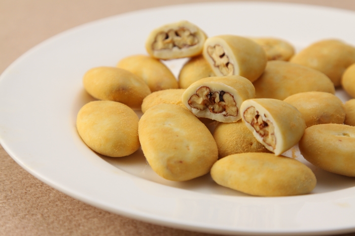 キャンディーコーティングした希少な天然のピーカンナッツを使用。なめらかで後味の良いホワイトチョコで包み、ふわっと軽いキャラメルパウダーをまぶして仕上げています。ちょこっとずつで食べやすい小分け仕様です。