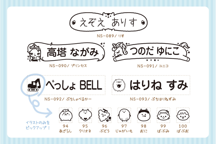 “いらすとフレーム”シリーズに、木の実をほおばったかわいらしいリスや、女の子に人気のプリンセス・ユニコーンを3種類追加。“ワンポイント”シリーズには、アザラシやクリオネ、じゃがいも、オニ、ハリネズミ、ショベルカー、女の子・男の子の9種類を追加し、全100種類になりました。オムツスタンプ以外の用途としても使いたくなる、愛着の湧くイラストです。