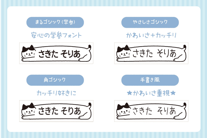 学参・旧字に対応した「まるゴシック」からかわいい「手書き風」まで、全4種類のフォント(書体)から選ぶことができます。また、ひらがなだけではなく漢字やローマ字にも対応しています。
