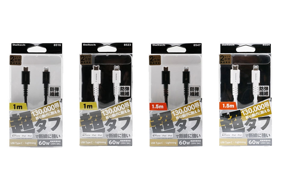 デジタルアクセサリーメーカーの株式会社オウルテック(神奈川県海老名市中新田5-24-1、代表取締役:東海林春男)は、高耐久仕様のケーブル「超タフ」シリーズの新製品として、13万回以上もの折り曲げに耐えるUSB Type-C - Lightningケーブル「OWL-CBKLTC10」(長さ1m)と「OWL-CBKLTC15」(長さ1.5m)を6月6日に発売します。価格はオープンで、想定市場価格はOWL-CBKLTC10が税別2,380円(税込2,570円)、OWL-CBKLTC15が税別2,480円(税込2,678円)です。全国の量販店をはじめ、直販サイト「オウルテックダイレクト」等にて取り扱います。