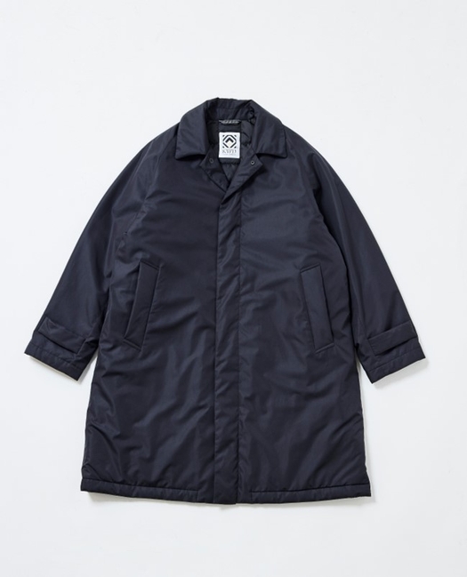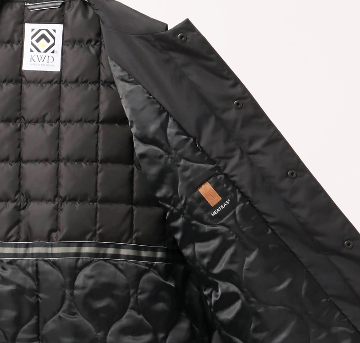 一般的にダウンコートは高い保温性が魅力である一方、ビジネスシーンではボリューム感があるためカジュアルな印象になりやすく、持ち運びや外出先での置き場に困るアイテムでもあります。そこで、今回のコートには、冷えを感じやすい背中部分に老舗羽毛専業メーカー河田フェザー社の「KAWADA DOWN」を使用。その他の部分に、吸湿発熱中綿「HEATES」を採用することで、保温性を確保しながらモコモコ感を抑えた、ビジネススタイルと好相性のステンカラーコートを企画しました。河田フェザー社は、国内外から良質の原料を仕入れ、独自の磨き洗い技術によりふっくらと軽く、保温性の高い高品質ダウンを提供し高い評価を得ています。また、「HEATES」は、体から発散される水蒸気を繊維が吸収し発熱する保温性に加え、消臭機能と制電性も兼ね備えた高機能中綿です。