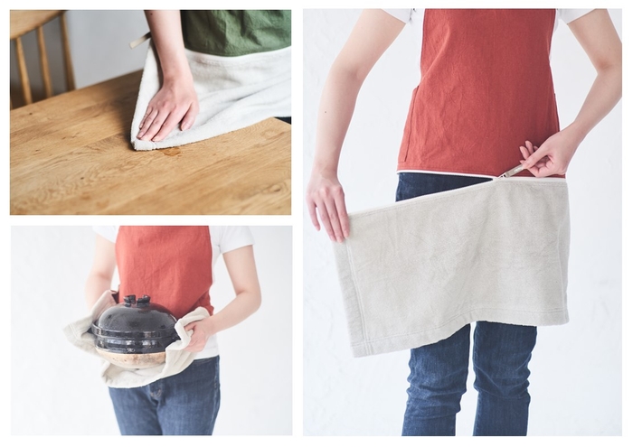 タオル部分には、その品質の高さで国外からも注目を集める今治産のタオルを使用。エプロン部分もすべて国内で縫製をしており、日本の丁寧なものづくりを感じていただけます。